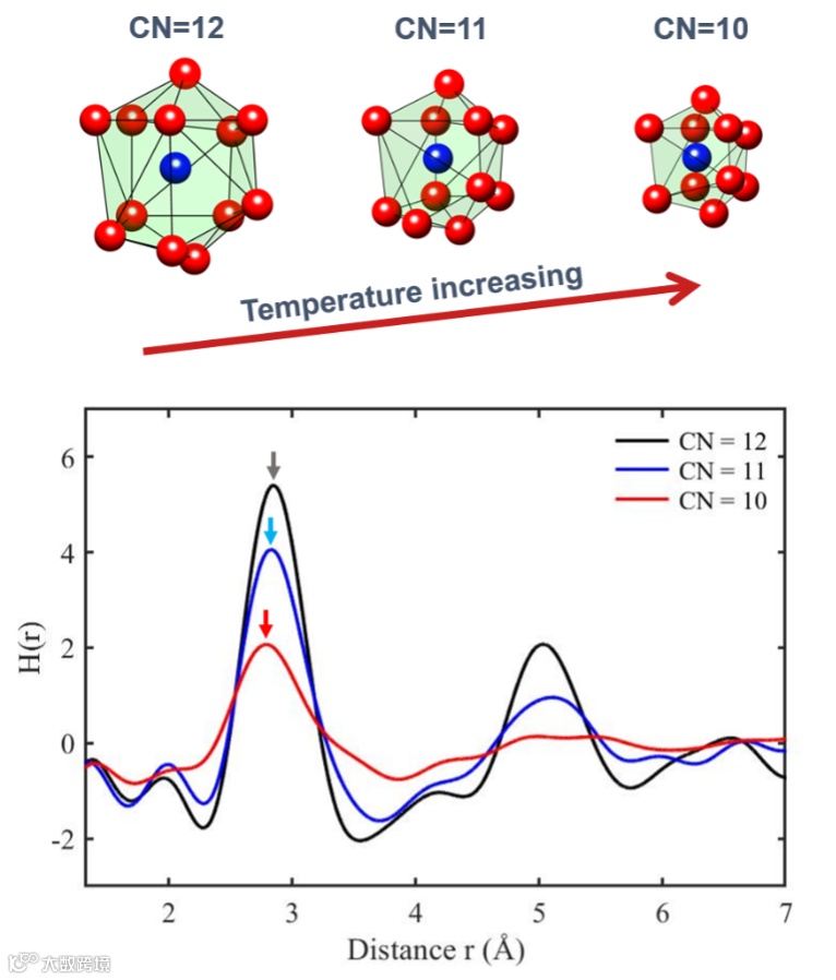 经过超快熔化过程之后,材料一般处于过热液态(温度高于沸点)。进一步的研究表明,与宏观上的热胀冷缩相反,随着温度增高,过热液态下的金属团簇会发生热缩冷账的“负膨胀” 现象:团簇中的最近邻原子由于其动能的增加而脱离中心原子的束缚,该中心原子的配位数(CN)会减少;低配位数团簇由于更强的结合力会导致中心原子和近邻原子的间距缩短。“负膨胀” 现象可通过原子径向分布函数第一个峰的位置进行研究,实验中发现该峰的位置在1000-6000度的范围内均随温度增高而逐渐变小,与分子动力学理论模拟结果符合较好。利用超短脉冲激光产生转瞬即逝的平衡态下难以研究的物态(如高达6000度的过热液态等),并结合超快电子衍射技术对这种状态下的结构演化进行探索,对于理解极端条件下的液态性质和玻璃态转变等过程有着重要意义。