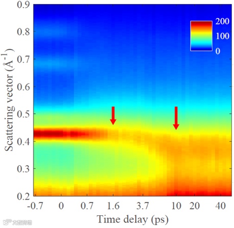 当强激光与材料作用时,电子温度会迅速上升并通过电子-声子耦合将能量传递给晶格;伴随晶格的温度升高,原子的振动幅度会增加。当原子的振动幅度大于约0.1倍晶格常数时,晶格间的结合力就无法把原子继续聚集在一起。此时,样品会熔化,发生从有序晶体态到无序液态的超快相变。实验中发现,当电子束相对于激光的延时为0.5皮秒(1皮秒=10⁻¹²秒)时,衍射环强度已经明显变弱,预示着样品已经开始失去长程有序性;当延时增加到1皮秒时,衍射环完全消失,说明铝在1 皮秒内就已经熔化为液态。