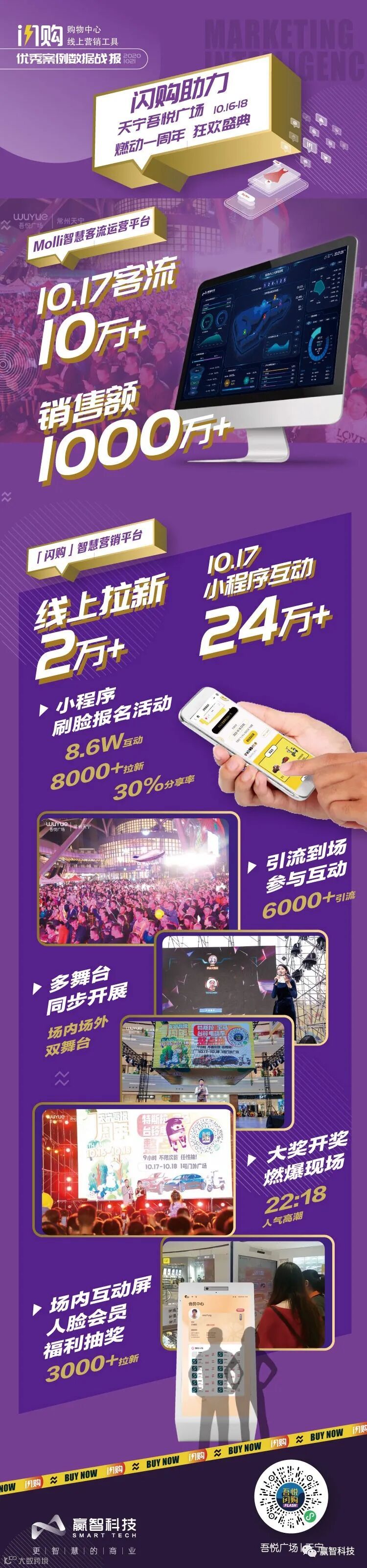 。单日客流突破10万,销售额超1000万!「闪购」小程序颜值抽奖、周年庆线上大促、场内互动屏联动...单日互动超24万人次,线上拉新2万+。