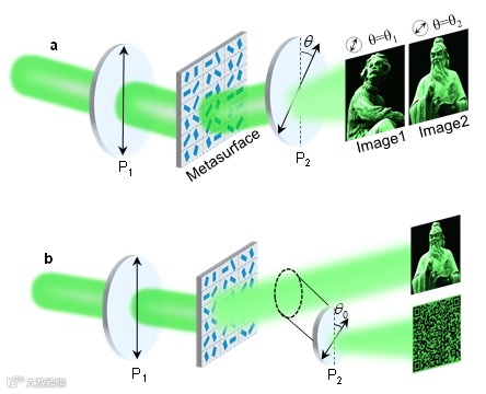 超构表面的一个重要应用是信息隐藏技术,主要体现身份证、货币、信息卡等信息安全领域的信息加密与防伪功能。受马吕斯定律启发,一幅图像的强度信息可以间接地通过光波的偏振态来实行编码。通过这种方式,私密信息可以安全地隐藏在均匀照明的光束下,只有借助于检偏器,才能将隐藏的图像信息在特定的偏振化方向上窥探出来。其中,正交偏振态通常被认为是其实现信息复用和隐藏技术应用的必要条件,即通过给相互正交的偏振光施加独立的编码信息,实现信息复用及隐藏等应用。基于该方法衍生的光场独立调控和信息安全问题,往往受到光场调控自由度和加密层级的限制。