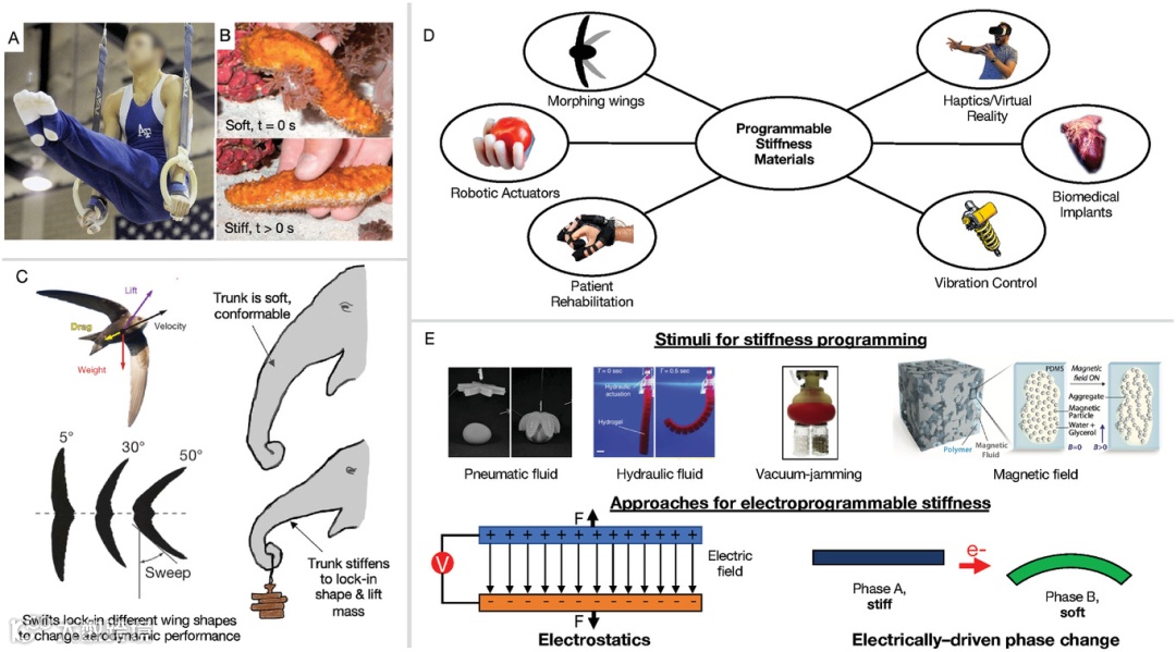 刚度是对任何材料系统都至关重要的力学特性,通常被认为是一个静态量。生物系统通常会调节其刚度以实现特定功能,调节其刚度的能力允许对环境变化的按需响应和实现优雅的功能,这是恒定刚度无法实现的。最近的工作表明,具有可编程刚度的新型材料可以提高性能并简化工程系统的设计,例如变形机翼、机器人抓手和可穿戴外骨骼。常用的几种刺激(如光、磁、热等)可以触发材料系统中可编程和可逆的刚度变化。虽然这些刺激在特定场景中都有优势,但它们都有明显的缺点。一些刺激需要笨重的设备,这会给工程系统增加相当大的设计复杂性、重量和成本,而另一些则导致缓慢、不均匀的材料响应。通过电刺激来编程刚度的能力是有利的,因为它与自动机器和机器人普遍存在的电传感、控制和电力网络具有自然兼容性。