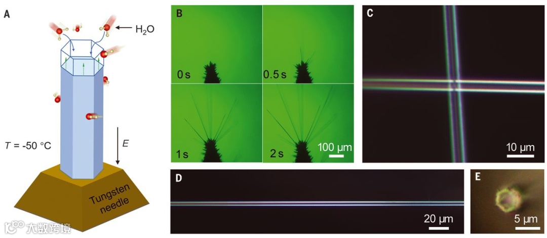 冰是地球表面上最丰富和最重要的结晶固体之一,在化学物理、生命科学、地球物理、天文学和其他学科的各种主题中发挥着重要作用。因此,在过去的几个世纪里,人们对冰进行了广泛的研究。大块冰具有刚性和脆性,会导致雪崩、冰川滑动和海冰破碎等自然现象。实验发现,其最大弹性应变远低于理论极限>10%。这种差异主要是由冰晶体的结构缺陷造成的。低维形式的材料,如纳米晶体、纳米线和超细纤维,由于较低的缺陷密度和更均匀的应力分布,可以表现出比其体积材料优越得多的机械性能。冰的纳米和微观结构以雪花和冰须的形式自然存在;预计这些冰块还具有比块冰更好的机械性能。虽然低维冰的结构,如冰须和冰针已经在实验室中生长,但研究的重点是生长和形态,而不是研究机械性能。