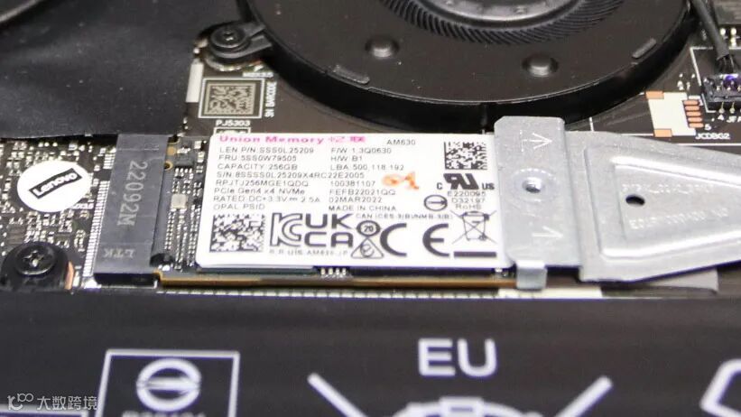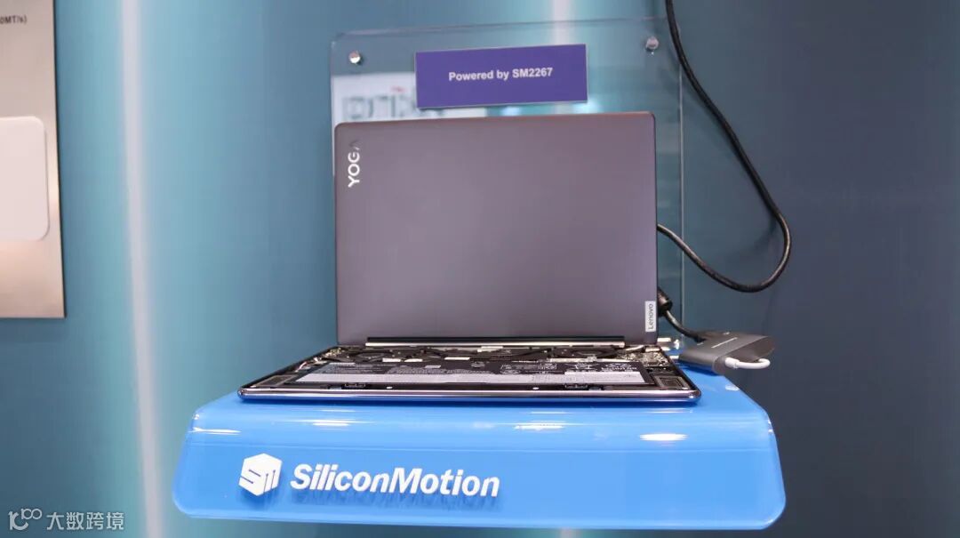 展台中间是一台来自联想的Yoga 9i二合一笔记本,作为一款高端轻薄笔记本,其搭载了12核16线程的i7-1260p处理器,16GB LPDDR5-5200MHz内存以及256GB PCIe 4.0 SSD,其中SSD正是来自采用慧荣科技SM2267主控芯片的Union Memory忆联AM630 SSD。