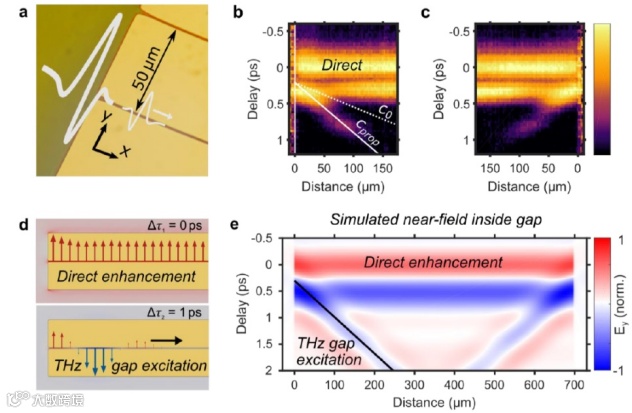 在此基础上,研究者们展示了单个领结天线内近场波形的时间分辨显微镜 (见图二,图三)。这是超高频设备、超材料和强场光与物质相互作用实验的组成部分。此外,还观察了太赫兹在亚波长间隙内的传播(见图四),从而在时域中引入了对受限结构内电场的超快采样。