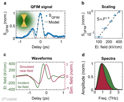 图三:领结天线内的 QFIM 信号和近场波形:(a)领结间隙中的局部 QFIM 信号(蓝色圆圈)和基于入射波形的建模时间发光演化(灰色)。(b)作为最大入射场强函数的峰值 QFIM 信号(圆圈)的缩放。(c)驱动远场波形(绿色)与领结间隙内的模拟局部近场(红色)的比较。(d)中显示的两种波形的对应频谱。