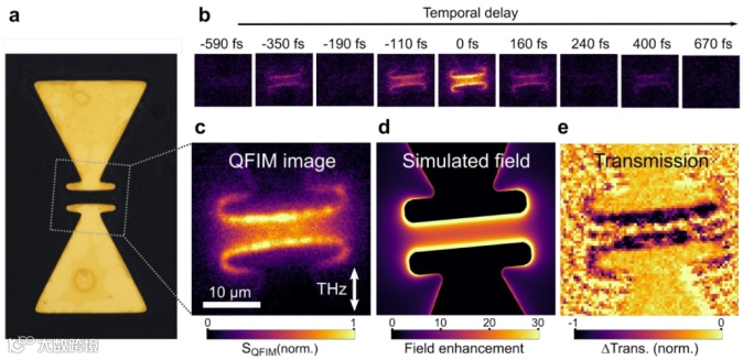 图二:谐振领结天线中太赫兹近场的演化:(a)太赫兹领结谐振器的光学显微图。(b)一系列选定延迟的后续微观快照。(c)量子探测场显微镜快照。(d)在共振间隙区模拟的空间近场分布。(e)在瞬态传输对比度中获得的快照证实了场驱动吸收调制是量子探测场显微镜信号的起源。