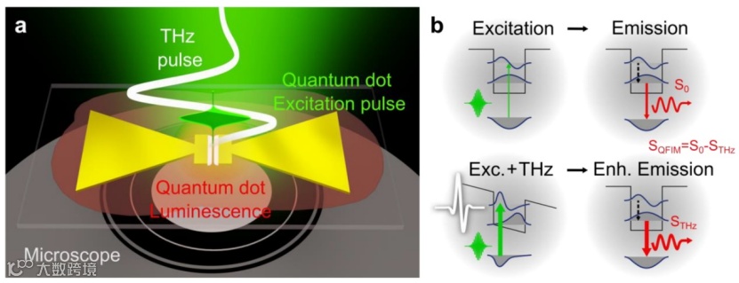 图一:量子探测场显微镜:(a)利用量子点发光对太赫兹电子近场的荧光显微镜成像。(b)太赫兹诱导的量子点能带结构的变化可以增加吸收并转化为增强的荧光发射,可通过光学显微镜获得。