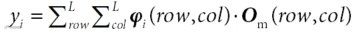 其中:row和col分别表示掩膜版单元(图像矩阵像素)所在的行数和列数。如果将矩阵φi和Om按照行(或者列)重新排列成长度为N=L×L的向量φi和O,那么式(1)可以方便地写为两个向量的内积: