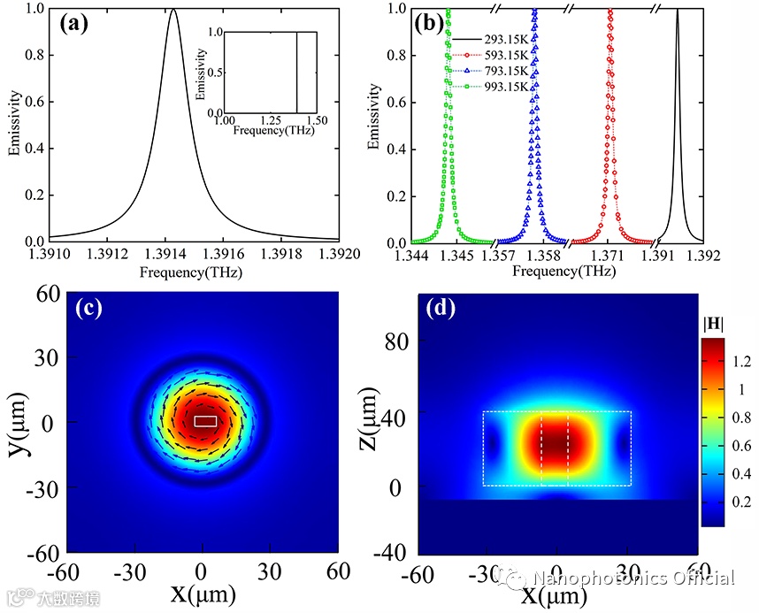 该文作者进一步研究了该结构的热辐射特性。如图3(a)所示,该结构在垂直发射的情况下,在1.0-1.5THz范围内只有一条发射光谱,因此不需要使用复杂的窄带滤波器来提取发射信号。在1.3914THz共振频率下相对发射率(与绝对黑体的辐射功率对比)接近1,并且谐振带宽低至125MHz。其中图3(c)和(d)表明准BIC模式的场分布主要集中在顶部的硅层,这与基于三明治结构的热辐射源情况不同。在整个热辐射过程中,圆形分布的位移电流将首先在硅盘阵列内部产生,位移电流将通过空气槽进一步耦合到真空中,并以平面波形式向上传播。他们的研究结果表明在不改变结构发射性能的同时,改变温度能够作为一种额外的手段来微调发射频率。