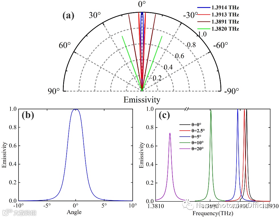 除了超窄带宽和线偏振特性外,该团队还进一步研究了基于准BIC谐振的太赫兹热辐射源的辐射方向性。如图4(a)所示,不同的辐射频率具有不同的峰值输出角度。对于任一频率,例如1.3914THz,随着输出角偏离中心角从0°增加到5°时,发射率从中心角度时的峰值1急剧下降到0,半高全宽仅为3°左右(图4(b)),所以该结构能实现具有高度定向的输出光束。在三维空间中,发射功率分布在一锥形区域内。在不同的发射方向上均有不同发射频率(图4(c)),但是对于特定结构,存在某一特定的辐射频率,例如本结构对应的1.3914THz。在该频率下,热辐射具有最高发射率,且垂直于结构表面,所发出的太赫兹光束具有高度准直的特性。