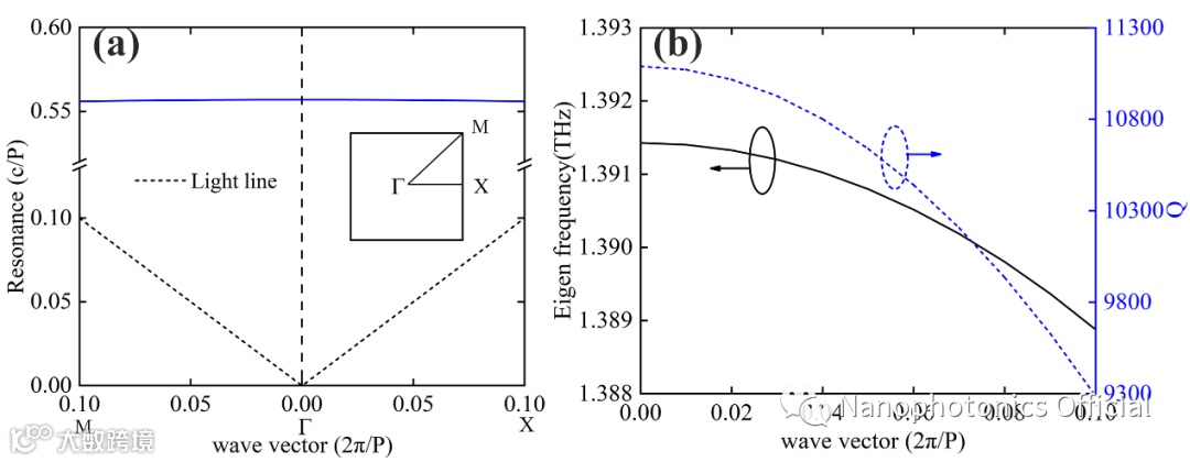 针对以上问题,山东师范大学研究人员提出了一种全新而有效的热辐射源实现方法。考虑到硅材料不仅资源丰富,而且结构制造与CMOS工艺兼容,他们以高阻硅(HRSi)作为最上层高折射率电介质。整个结构类似于基于金属超材料中的三明治结构,底部黄色反射基板由铜材质制成(见图1)。首先,他们对结构支持的共振色散特性进行了研究。如图2(a)所示,空气中光色散曲线(虚线)上方的锥形区域是辐射连续域,可以看到开槽硅盘阵列支持的共振(蓝线)正好落在该区域内。图2(b)表明本征频率和品质因子与横向波矢轻微相关。在波矢量为0时,品质因子达到1.11×104;随着横向波矢的增加,本征频率与其品质因子都轻微减少,然而整体品质因子始终保持9×103以上。这表明无论是垂直入射还是略微倾斜入射,都可以获得高品质因子的谐振。这些品质因子的值明显高于传统介电热辐射源或金属热辐射源,并且还可以通过空气槽的尺寸和位置进一步调节。准BIC本征频率对横向波矢量的依赖性也意味着对于该结构,当入射角发生变化时,准BIC本征频率将发生偏移。相应地,当该结构用作热辐射源时,热辐射将在不同频率下存在不同的发射倾角。