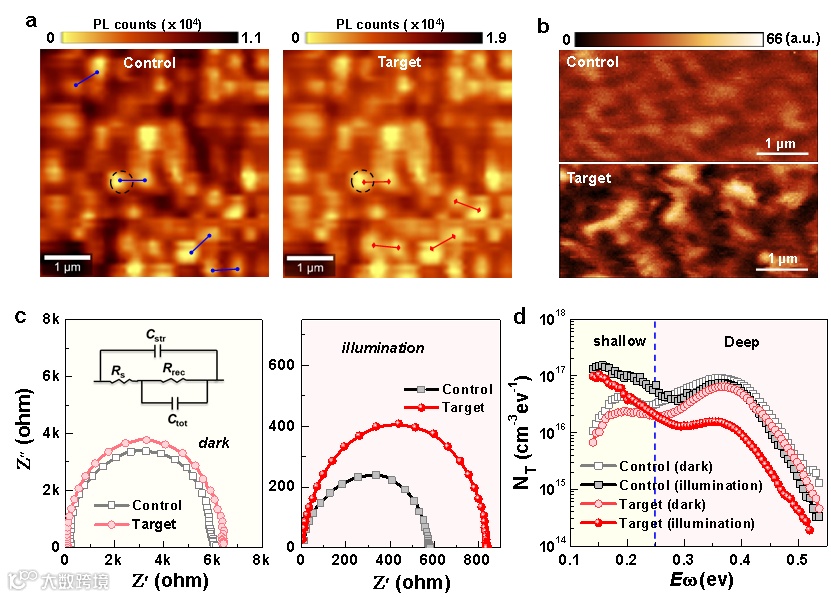 图2. 钙钛矿薄膜性能变化分析。(a)在532 nm激发下测量的MAPbI3薄膜的PL扫描结果。参考样品:PAT掺杂的 MAPbI3薄膜。目标样品:Au@PAT掺杂的MAPbI3 薄膜;(b)在532 nm激光照射下钙钛矿薄膜的近场扫描结果分布;(c) 光照和暗态下钙钛矿器件的电化学阻抗谱。(d) 光照和暗态下钙钛矿器件的陷阱密度(tDOS)分布。