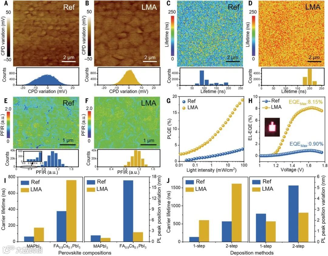 通过XRD表征发现这种溶液相生长得到的钙钛矿薄膜展示了更高的晶化程度,钙钛矿晶体的峰增高,而且荧光强度比对比器件提高10倍、荧光寿命也显著提高,因此钙钛矿薄膜的质量得到显著提高,这与SEM、XRD结果之间相互印证。