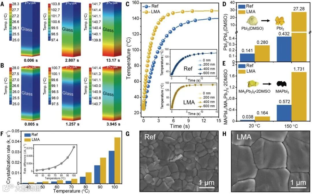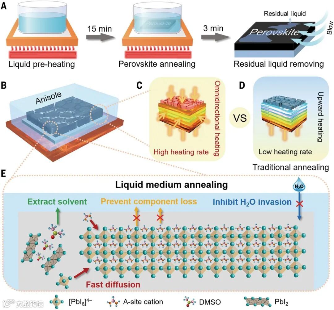 有鉴于此,北京理工大学陈棋、北京大学周欢萍等人报道了一种液体介质退火技术LMA(liquid medium annealing)制备钙钛矿太阳能电池的薄膜。该技术在钙钛矿薄膜生长过程中构建了高活性化学环境和稳定的加热场,通过这种方法合成的钙钛矿材料表现出优异的结晶度、更低的缺陷密度、理想的化学计量比、较高的化学组成均匀性。