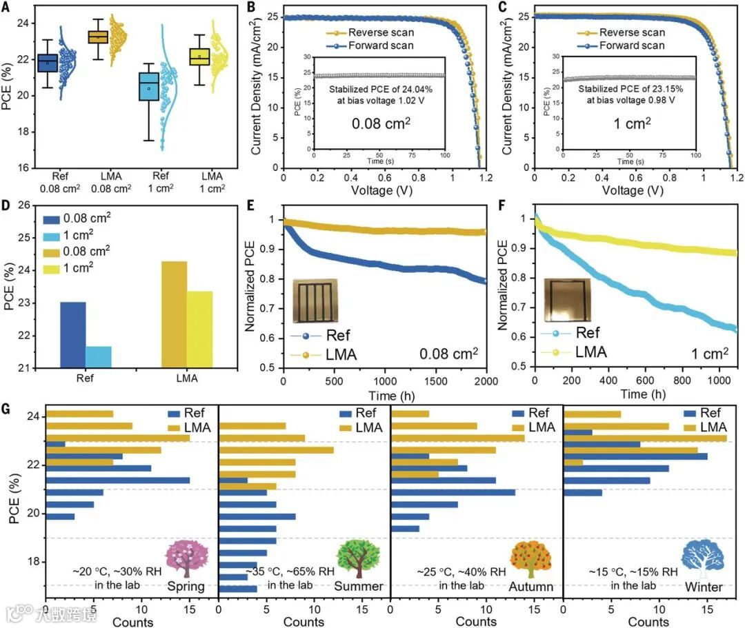 面积为1 cm2的电池稳定峰值输出功率为23.15 %(认证功率22.3 %),在1120 h连续工作后保持最初90 %的效率,这个结果说明这种溶液相处理过程具有大规模化制备电池器件的可能性。