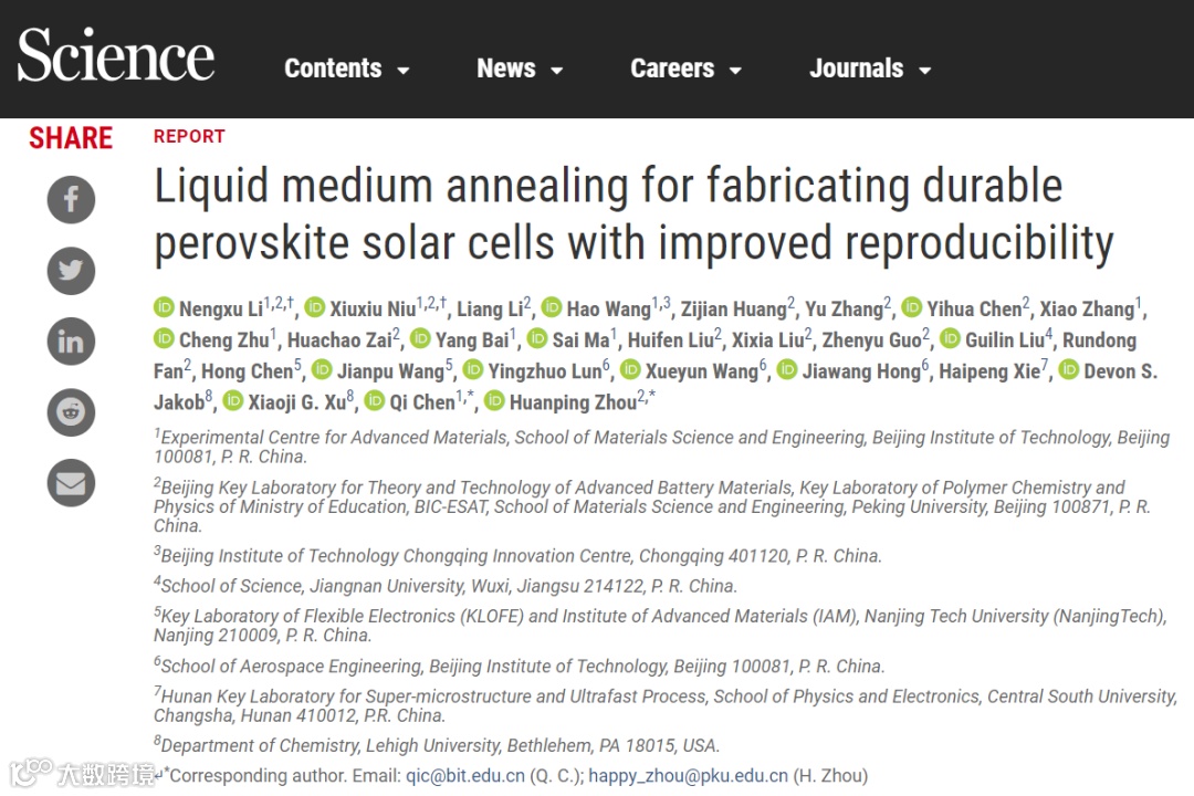 Nengxu Li et al. Liquid medium annealing for fabricating durable perovskite solar cells with improved reproducibility, Science 2021, 373 (6554), 561-567