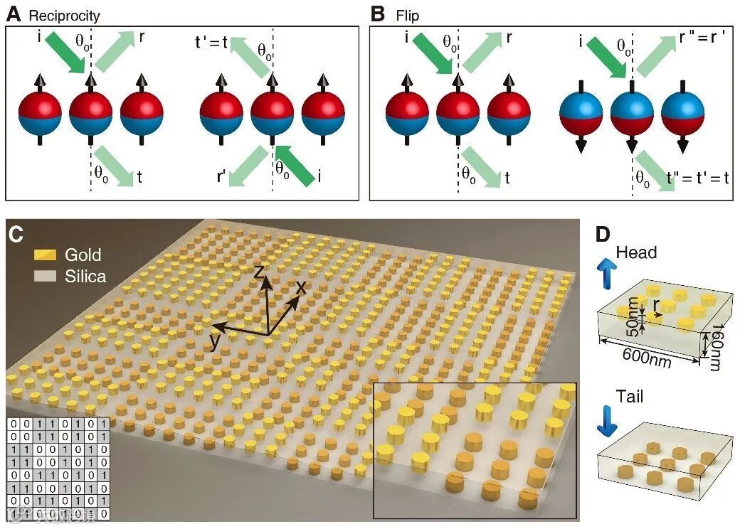。进一步的,将图2A中的微纳结构进行空间反演操作,得到图2B右侧所示的微纳结构。假设结构在面内具有高对称性以确保不同偏振之间没有耦合,此时空间反演操作就可以简化为翻转操作(flip)。图2B中的两种结构可以用翻转的箭头(或head和tail单元)来表示。通过考虑空间反演和互易律,研究团队发现对于任意的入射方向,这两种微纳结构的透射率都严格相等,而反射率一般不相等,即