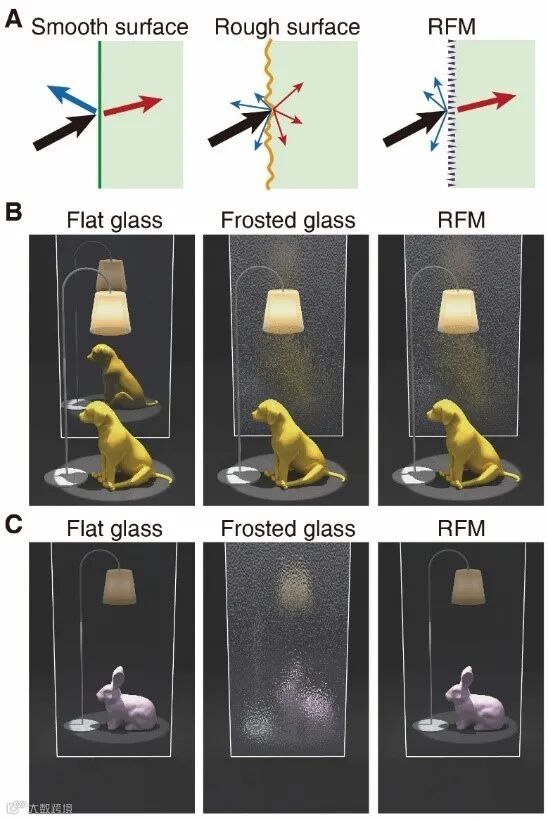 要消除镜面反射,一种方法是利用减反膜/增透膜。但是这种方法一般在入射角和频率范围上有较大限制,价格昂贵,而且丧失了调节透射率的自由度。另一种方法是通过将光滑表面变成粗糙表面,从而引入漫反射,将反射光分散到不同的方向上。然而,粗糙表面一般也会同时影响透射光,导致透射成像不再清晰。一个简单的例子就是毛玻璃,既没有反射倒影也不能看清其后的物体。透射清晰成像(透明)和漫反射是两种非常宝贵的光学功能,但是分别对应于光滑表面和粗糙表面。在传统光学看来,这似乎是鱼和熊掌不可兼得。那么,现代光学中能否找到一个方法,解决这个看似相互矛盾的古老难题呢?需要指出的是,透射清晰成像和漫反射这两种功能都需要在可见光的宽频范围内工作才有实际应用价值。