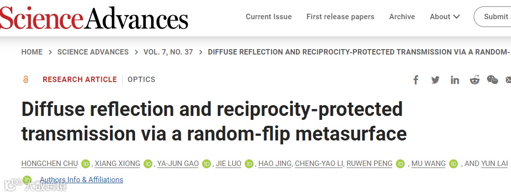 该研究成果近期以“Diffuse reflection and reciprocity-protected transmission via a random-flip metasurface”为题发表在Science Advances 7, eabj0935 (2021)上。 本文第一作者为南京大学的褚宏晨助理研究员和熊翔副教授。通讯作者为南京大学的赖耘教授、彭茹雯教授和王牧教授。合作者包括苏州大学的罗杰副研究员以及南京大学的高雅君博士、景灏博士、李成尧博士生。研究工作得到南京大学物理学院、固体微结构物理国家重点实验室、人工微结构科学与技术协同创新中心等平台支持,获得科技部重点研发计划,国家自然科学基金和南京大学登峰人才计划B等项目资助。