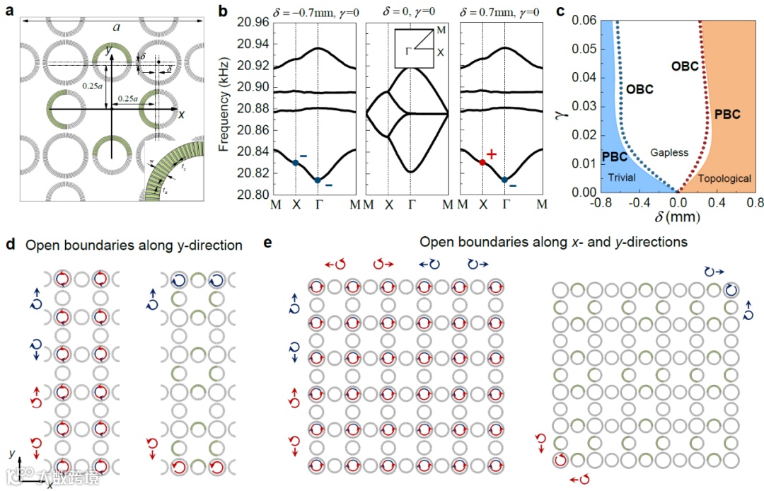 图1.(a)声子晶体原胞;(b)厄米条件下的能带及高阶拓扑相变;(c)非厄米条件下传统体-边界对应关系的失效;(d),(e)自旋极化的非厄米趋肤效应,左侧为厄米条件下的声波传播示意图,右侧为增加偏置损耗下的情况。