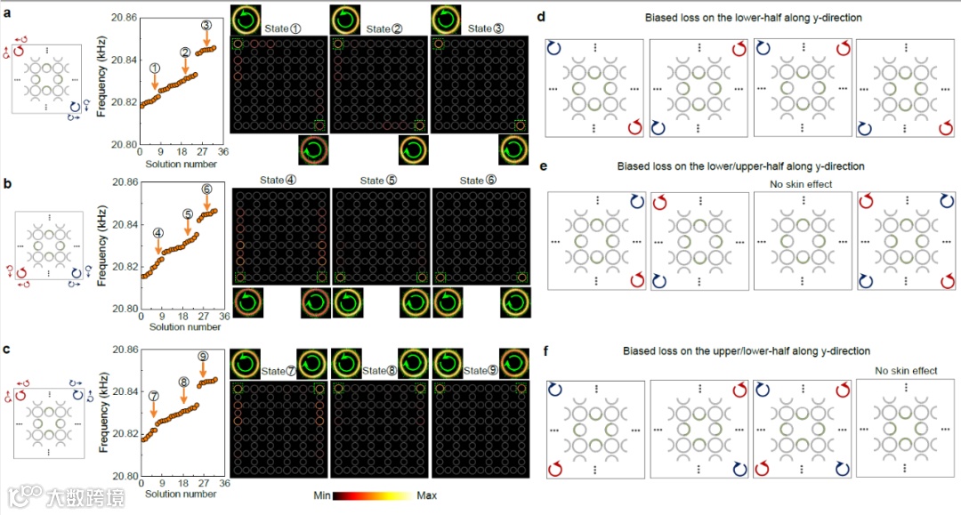 图4. (a)-(c)不同声学损耗构型下对应的不同自旋极化的非厄米趋肤效应及能谱和本征模式声场分布图;(d)-(f)其他12种不同损耗构型对应的趋肤效应规则。