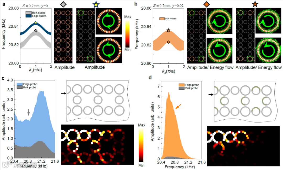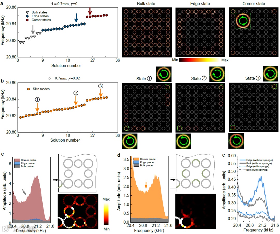 图3.(a)x 和y方向均为开放边界条件下的本征能谱;(b)对应(a),但增加了声学损耗;(c)-(e)高阶非厄米趋肤效应的实验测量,包括透射谱和声场扫描。