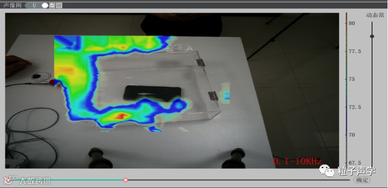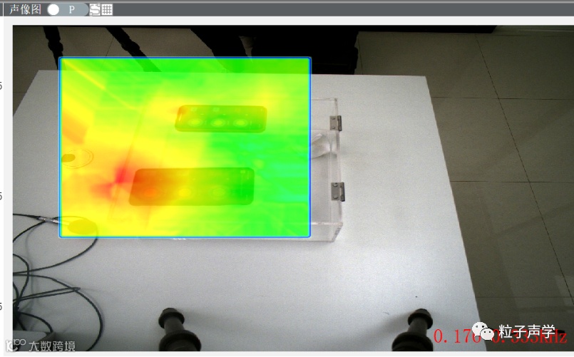 把声源声音调至1200Hz。声学相机成像如下图所示,声像云图覆盖了整个盒子,但仅能看到大的声源位置,无法定位出是盒子哪个部位泄露的噪声。