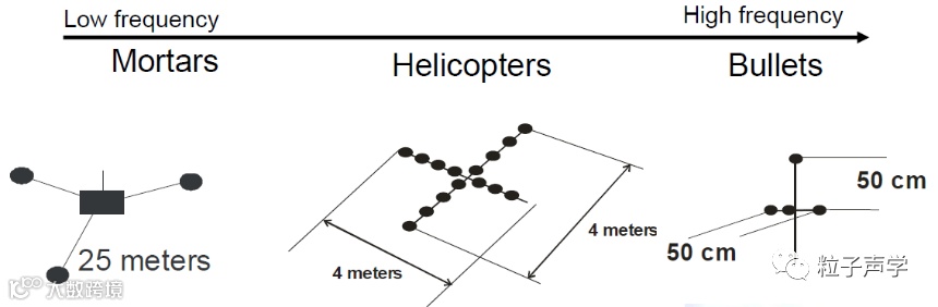 如上图所示,时延估计要求麦克风间距d小于等于所分析噪声的波长的一半,否则相位模糊导致时延估计错误。传统的标量声学相机因其定位原理,决定了标量声源定位的局限性,如1)麦克风阵列的尺寸决定了其所能测量分析的目标噪声频率下限;2)阵列尺寸越小,低频噪声的定位准确度越低;下图是各种声源探测用标量阵列的尺寸示意。