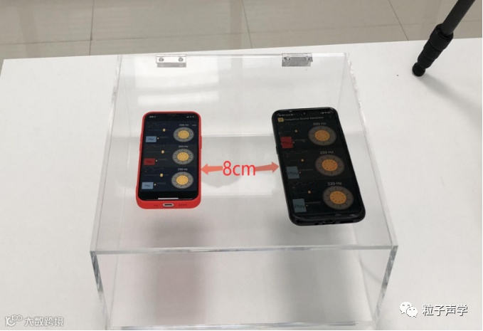 我们把手机打开作为声源,放入一个30cm*30cm*12cm的亚克力盒子里,在盒子左侧盖垫张餐巾纸掀起盒子约2mm。(手机用的是SoundGeneratorAPP发声)