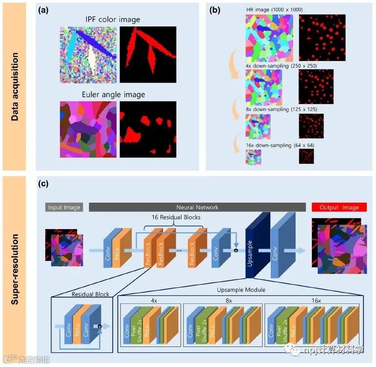 来自韩国浦项科技大学人工智能研究院和机械工程系的Hyoung Seop Kim和Seungchul Lee领导的团队,提出了一种快速、准确的基于深度学习的超分辨技术,称为超分辨残差网络。该技术利用合成的微观结构图像来克服数据不足的问题,进行网络训练,最后用真实和合成的微观结构图像对该技术进行了验证评估。结果表明,基于图像相似性度量、微观结构表征和使用基于微观结构的有限元模拟的力学分析,开发的超分辨技术能够快速获取与HR EBSD图像相当的超分辨EBSD图像。该研究在数字微观结构处理方面提供了一种快速准确的可行方案,对材料研究尤其在金属材料的表征和力学分析方面具有重要的意义。该文近期发布于npj Computational Materials 7: 96 (2021)。