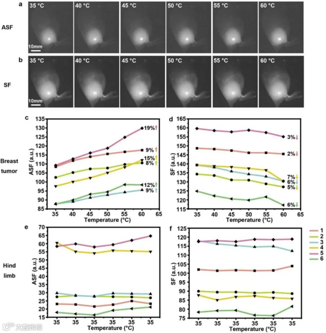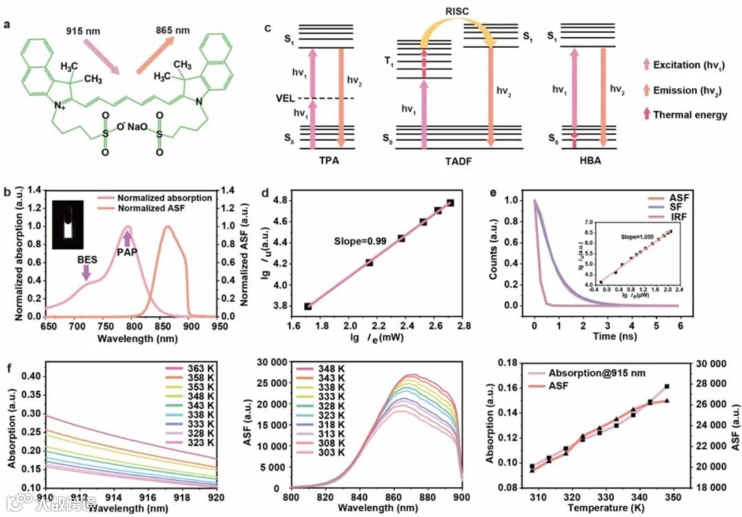 图一:二甲基亚砜中吲哚菁绿溶液的反斯托克斯荧光特征。(a)吲哚箐绿分子结构。(b)吲哚菁绿溶液的反斯托克斯荧光光谱和吸收。(c)有机分子的不同反斯托克斯荧光过程。(d)对数图显示了吲哚菁绿反斯托克斯荧光在865 nm激发光(915 nm连续激光)上的功率依赖性。(e)吲哚菁绿的反斯托克斯荧光和斯托克斯荧光寿命。(f)在915 nm连续波激光激发下,吲哚菁绿的吸收光谱(910 nm - 920 nm)和反斯托克斯荧光光谱(800 nm - 900 nm)的温度依赖性。