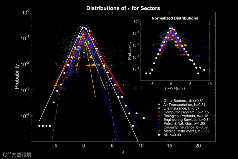 而且,我们还发现,每个具体公司的确很难预测其行为,但是它们偏离这条生长曲线的涨落大小却也遵循严格的数学规律, 这一规律很好地服从了拉普拉斯分布: