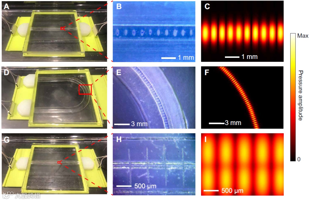 图2使用阴影波导声镊进行实验设置和粒子操作。(A)制造装置的照片。(B)负对比度 (PDMS) 粒子沿直线阴影波导的汇聚和操控。(C)PDMS-水界面对应的模拟压力幅值。(D 到 F)样品照片、实验粒子图像和阴影波导以沿弯曲路径操纵粒子的模拟压力分布。(G 到 I)耦合阴影波导,用于操纵具有正声学对比度的聚酰胺颗粒。各向异性势阱不仅可以捕获和移动粒子,还可以在势阱内对它们进行排列。同时,通过控制驻波比,可以调整各向异性势阱。
