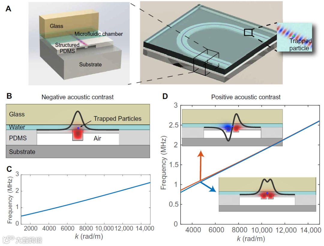 图1微流体腔室和阴影波导的图示和特性。(A)玻璃板和一层结构化的聚二甲基硅氧烷 (PDMS) 结合了微流体腔室。微流体腔室中的声场是通过被称为阴影波导的外部结构控制的。微流体室中的粒子受到阴影波导场的影响,因此可以在没有物理边界的情况下进行束缚和操作。(B)横截面图显示了设计用于捕获负声学对比粒子的阴影波导的模式。(C)阴影波导的线性色散使它具有较宽的工作频率范围 (D)可以设计不同的结构,例如耦合的平行波导,以实现用于操纵具有正声学对比度的粒子的模式,这些粒子被局部压力最小值捕获。