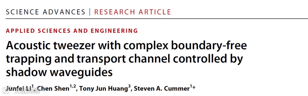 近期,来自杜克大学的Steven A. Cummer团队以及Tony Jun Huang在《Science Advances》上发表了研究论文“Acoustic tweezer with complex boundary-free trapping and transport channel controlled by shadow waveguides”,提出了一种利用“阴影波导(shadow waveguide)”调控声场,并在自由边界腔室中实现粒子在空间中复杂捕获和操控的方法,并通过实验证实了该系统粒子捕获、粒子操纵和传输的能力,同时实现了Thouless 泵浦(Thouless pumping)。