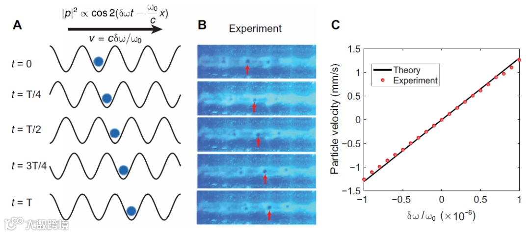 图3 Thouless 泵浦的实验演示。(A)Thouless泵浦利用空间和时间都发生变化的势场来操纵其中捕获的粒子。可以通过合成所需的势场来精确控制速度。(B)一组时间序列的实验照片,显示粒子在一个循环中是如何被泵送的。(C)抽速与输入场的调谐频率成线性比例。实验粒子速度与理论预测非常吻合。