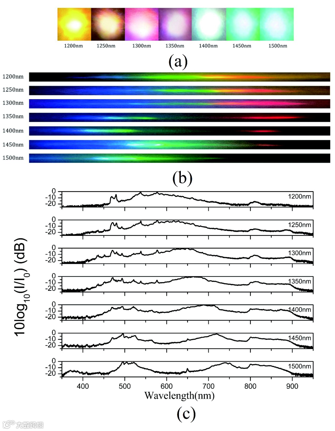 图3. 入射光o偏振方向的白光激光产生实验结果。(a) 不同泵浦波长下的输出光斑的空间分布;(b) 栅分光后的1级衍射光斑;(c) 输出的超连续光谱分布。