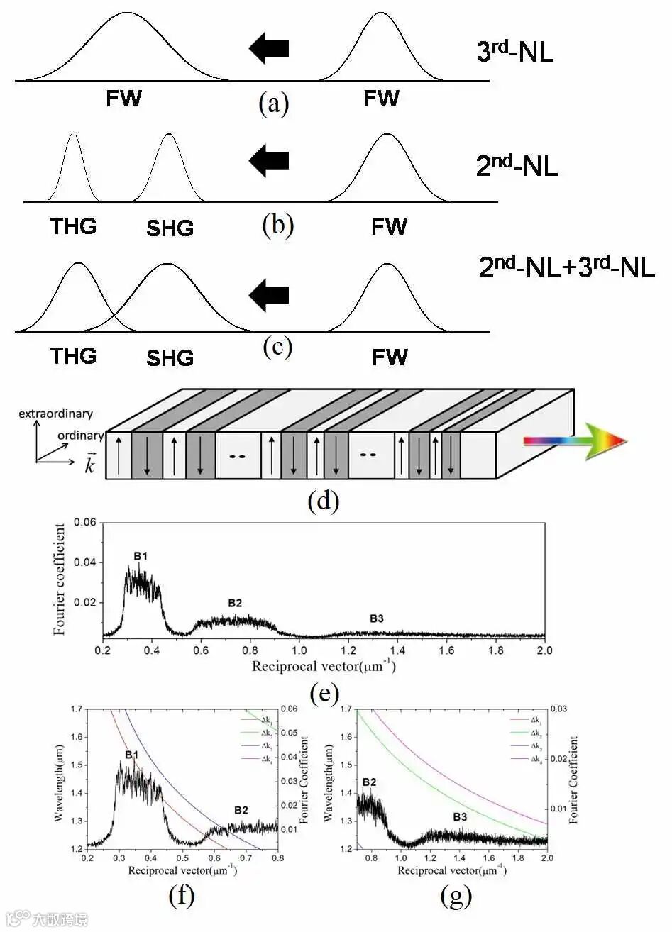 图1. CPPLN晶体通过二阶和三阶非线性产生可见-近红外白光激光的原理图。(a) 飞秒激光通过非线性过程的光谱展宽示意图;(b) CPPLN中近红外泵浦飞秒激光通过级联的上转换效应可以同时实现宽带的SHG和THG;(c) 二阶和三阶非线性的协同作用可以产生光谱展宽的SHG和THG,实现光谱覆盖整个可见光波段的白色激光;(d) CPPLN的结构设计,向上箭头和向下箭头分别表示正畴和负畴;(e) 样品的有效非线性系数谱;(f-g) 不同倒格矢带能够为二次谐波和三次谐波非线性过程的相位失配提供补偿。