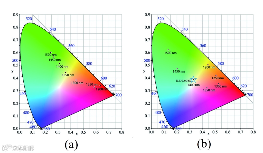 图4. CIE色度坐标下的样品输出光斑的色域演化。(a) 入射光为e偏振的结果;(b) 入射光为o偏振的结果。