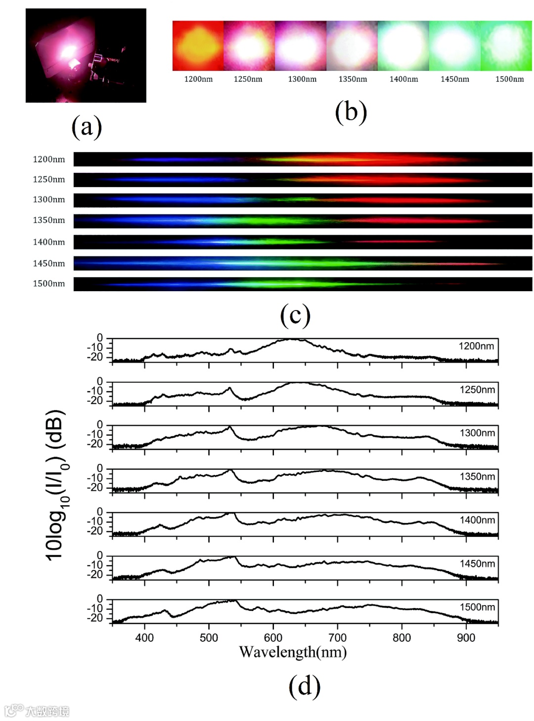 图2. 入射光e偏振方向的白光激光产生实验结果。(a) 在样品出射端观察到刺眼的光斑;(b) 在不同泵浦波长下的输出光斑的空间分布;(c) 经过光栅分光后的1级衍射光斑,表明输出的超连续谱覆盖整个可见光波段;(d) 输出的超连续光谱分布。