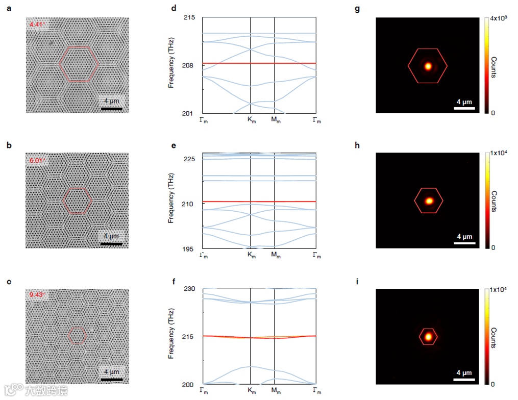 图3 不同转角(4.41º、6.01º和9.43º)下,魔角激光器的电子显微镜照片(a-c)、能带结构(d-f)和激射近场光斑照片(g-i)