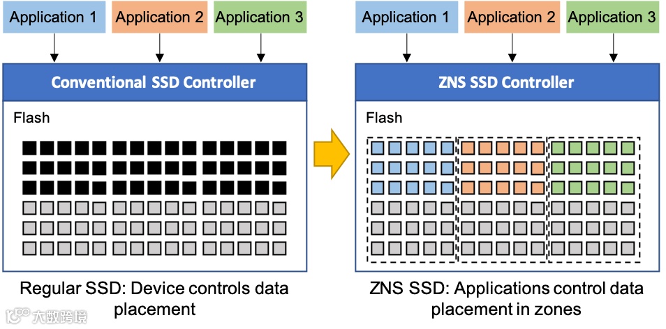 经过多次更新后,NVMe 2.0规范中的ZNS现已支持根据数据使用频率进行分区,并将它们按顺序存储在固态硬盘内的独立区域,从而减少对存储数据的重写和重新排列,降低硬盘的写入放大系数(write amplification factor,WAF),最终实现整体硬盘的性能和寿命的提高。
