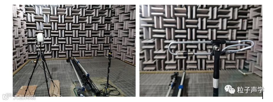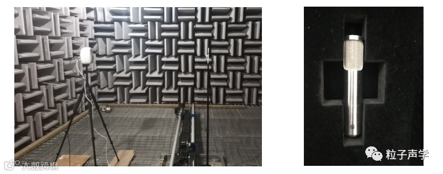 基于P-P测试技术,丹麦BK公司有一款声强探头仪器箱(型号:3599)。3599型使用双传声器技术,在20-6300Hz频带范围,1/3倍频程的中心频率处测量声强。南京粒子声学科技有限公司生产的矢量传声器,基于P-U技术来测试声强。为了验证矢量传声器测试声强的准确度,在声学所的全消声室进行了声强对比测试。图1所示的P-P测试技术,采用BK公司的声强探头。图2所示的P-U测试技术,采用粒子声学的1/2矢量传声器(型号:1910114)。