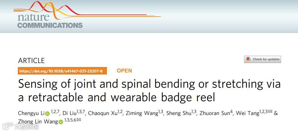 近日,中国科学院北京纳米能源与纳米系统研究所Zhong Lin Wang和Wei Tang老师研究团队通过结合可伸缩的徽章卷轴和光栅结构的摩擦纳米发电机(TENG),开发出一种小体积、高精度的可拉伸传感器,用于可穿戴和实时监控人体运动,具有8 V/mm的拉伸灵敏度、0.6 mm的最小分辨率、低滞后性和高耐用性(超过12万次循环)。相关研究工作以题为“Sensing of joint and spinal bending or stretching via a retractable and wearable badge reel”发表在国际顶尖学术期刊Nature Communications (IF=12.121)上。