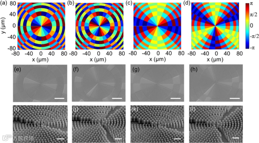图2 介质超构表面波带片的设计和制备。(a-d)设计携带不同拓扑荷的超表面波带片的相位分布图,(a) l = 2, (b) l = 3, (c) l = ± 2, (d) l = ± 3;(e-h) 对应于图(a-d)制备得到的超构表面样品的电子显微镜图像,比例尺:20 μm;(i-l)对应于图(e-h)的侧视电子显微镜图像,比例尺:1 μm。