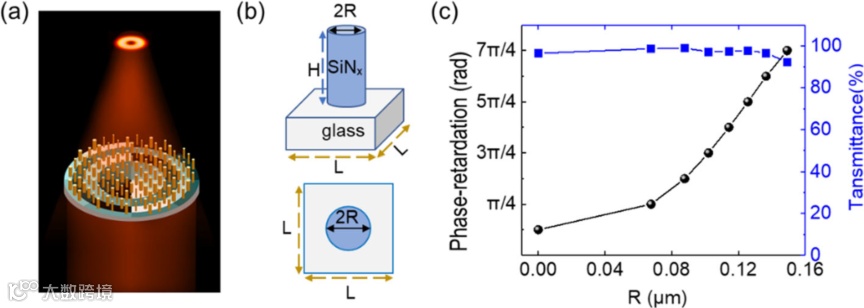 图1 介质超构表面波带片。(a)结构示意图;(b) SiNx超构单元的侧视和俯视图;(c)不同半径大小的超构单元周期排列,在633 nm波长处计算得到的相位延迟和透射率,其中高度 H = 1μm, 周期L = 430 nm。