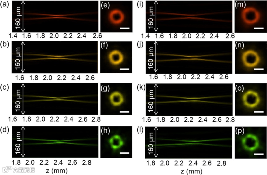 图3 不同波长入射光所对应的涡旋光束强度分布。其中(a-d)携带拓扑荷l = 2,(i-l)携带拓扑荷l = 3,波长为(a, i) 633 nm,(b, j) 600 nm,(c, k) 570 nm和(d, l) 532 nm;(e-h)和(m-p)是在对应于(a-d)和(i-l)的焦平面处测得的强度分布,比例尺:10 μm。