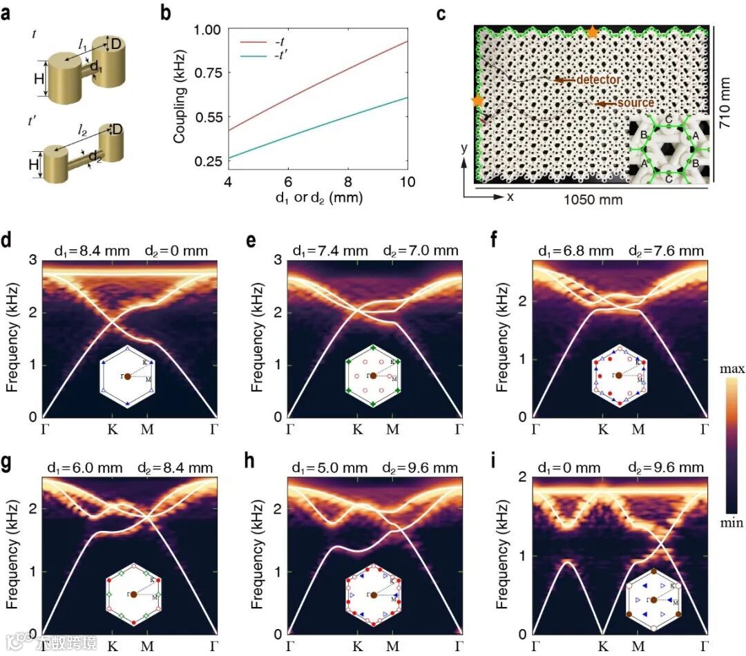 图3. Kagome声学超材料和非阿贝尔拓扑结点。(a)圆柱形声学谐振腔来构建Kagome格子;最近邻(次近邻)耦合用水平管来实现。(b)改变直径调节最近邻和次近邻耦合。(c)测量体能带和边界态结构的实验装置照片。(d-f)超材料的声学能带结构。