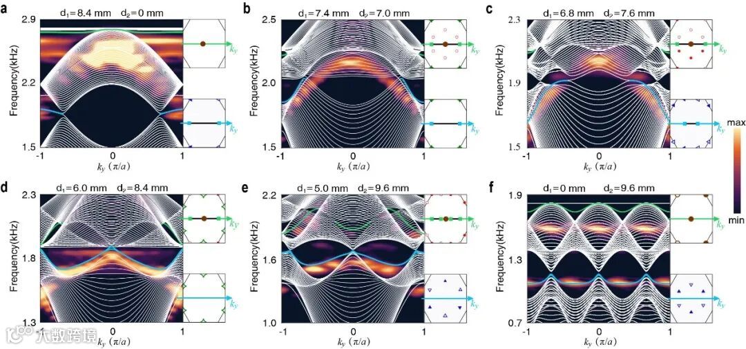 导致出现(缺失)边界态。因此,边界态的出现和缺失反映了能带结点在布里渊区边界的投影。利用声学系统不受费米-狄拉克填充效应的优点,此研究测量两个带隙I和II的边界态,研究多带隙体边物理。