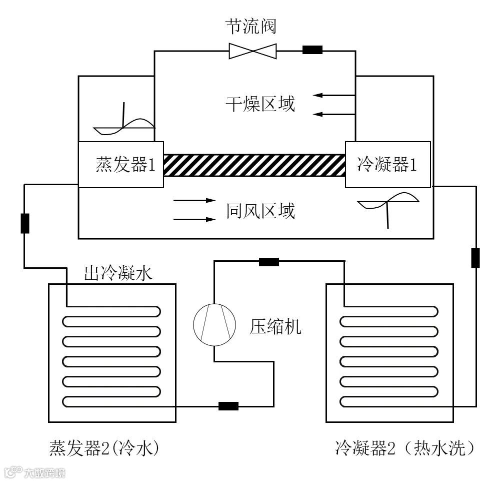 因此,利用热系技术降低干燥能耗对于减缓能源紧张局面其有重要现实意义,热泵干燥系统工作时,热干空气进入干燥室内吸收物料水分,变成热湿空气,制冷剂在蒸发器吸收干燥室排出热湿空气中的全热,蒸发为气体,经压缩机压缩后被输送到冷凝器中放出冷凝热,加热蒸发器脱水后的干冷空气,由冷凝器出来的干热空气再进入干燥室,燥空气和制冷剂均实现闭式循环。